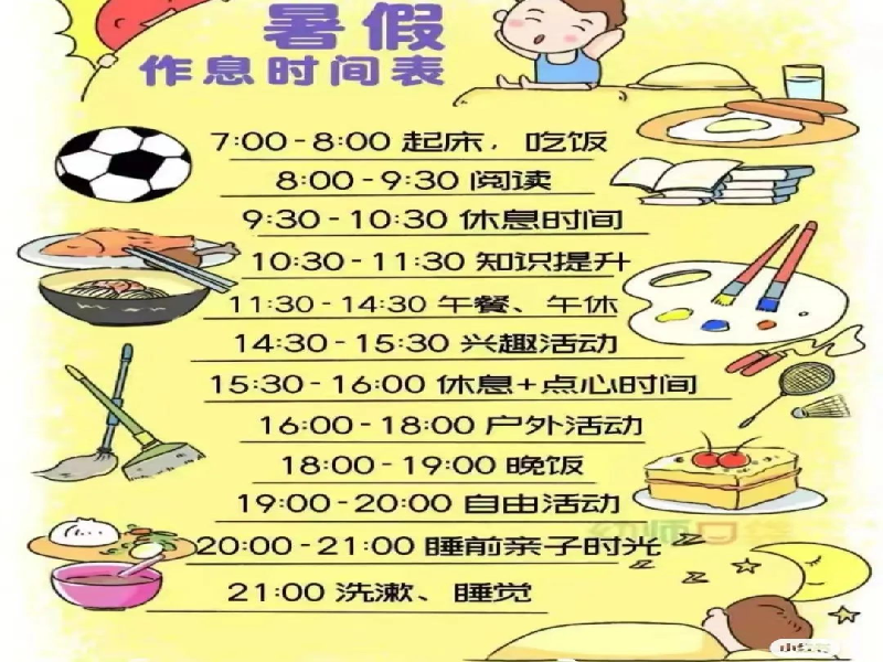 孩子们在家可以做些什么呢?比起漫无目的地玩耍,不如来制定一份暑假计划吧!家长可遵循孩子已有的生活规律,与孩子交流、讨论,共同制订暑假每日活动计划表,继续保持有规律的作息制度。