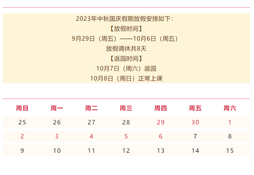 根据《国务院办公厅关于2023年部分节假日安排的通知》,结合我园实际,现将我园2023年中秋、国庆放假通知安排如下: