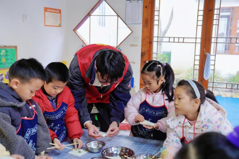 冬至时,有吃馄饨的习俗。馄饨的外形就像一颗颗饱满的小元宝,所以也叫“元宝汤”,寄托着人们对美好生活的期望。今天,志愿者们也带领孩子一起动手包馄饨,吃一个小元宝,喝上一碗热乎乎的“元宝汤”,饮食坊里充满着欢声笑语。